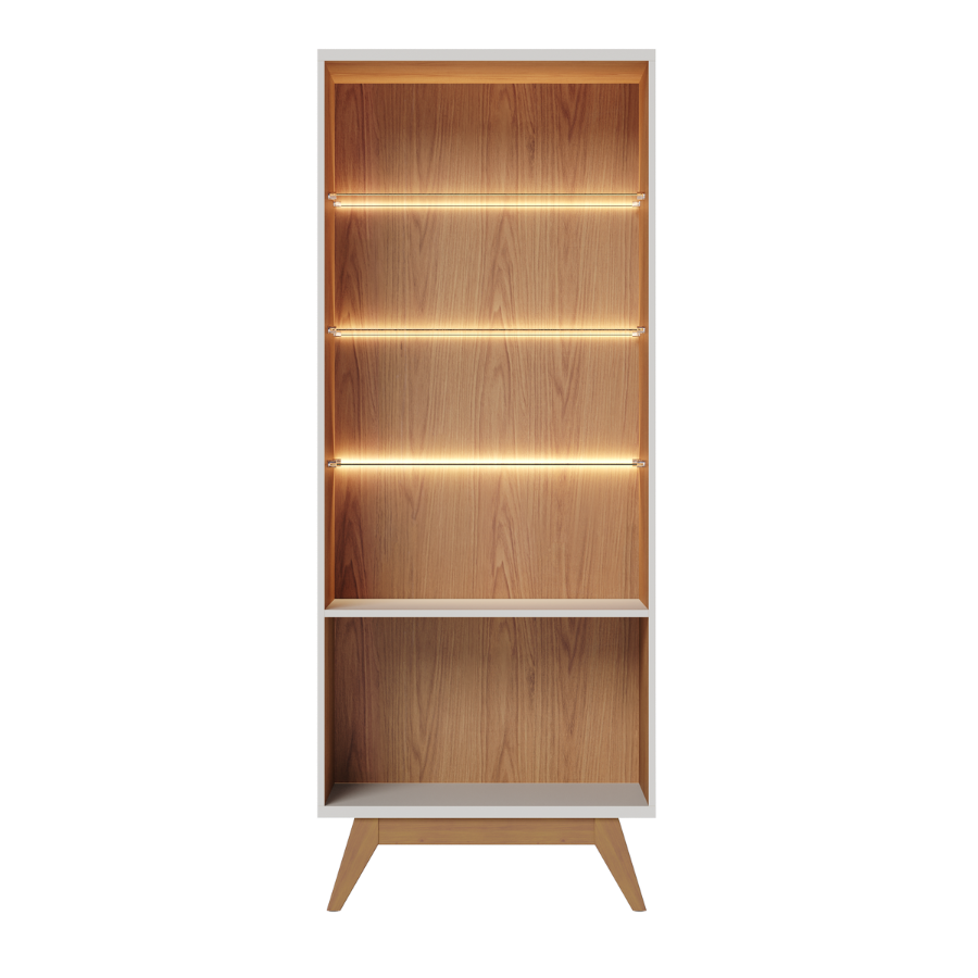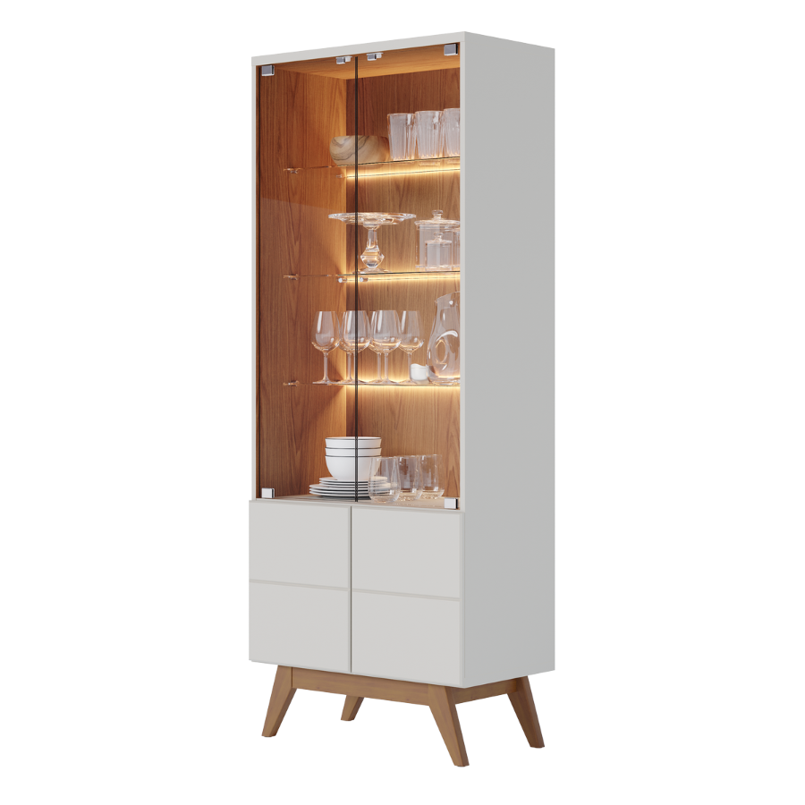 Con un diseño moderno y sofisticado, la Cristalera se destaca por sus patas de madera maciza de alta calidad. Ofrece un amplio espacio interior, con dos puertas de madera con detalles biselados, además de dos puertas de vidrio templado con tiradores de aluminio dorado. Cuenta con tres estantes de vidrio, perfectos para exhibir vajilla y copas, que incluyen iluminación LED, aportando un ambiente aún más acogedor y elegante.